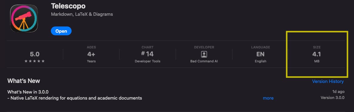 Telescopo is 4MB. VS Code is 370MB. I could make Telescopo bigger. Add frameworks. Include libraries. Bundle dependencies. Make my life easier.